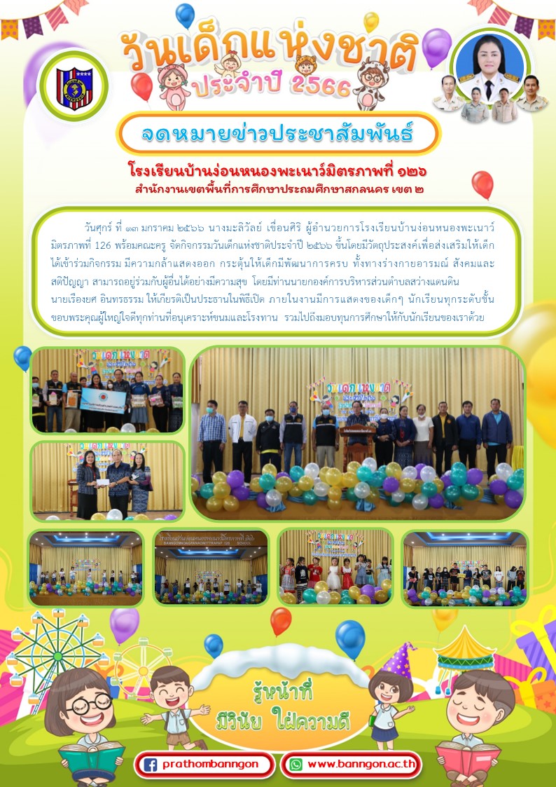 วันศุกร์ ที่ ๑๓ มกราคม ๒๕๖๖ นางมะลิวัลย์ เขื่อนศิริ ผู้อำนวยการโรงเรียนบ้านง่อนหนองพะเนาว์มิตรภาพที่ 126 พร้อมคณะครู จัดกิจกรรมวันเด็กแห่งชาติประจำปี ๒๕๖๖ ขึ้นโดยมีวัตถุประสงค์เพื่อส่งเสริมให้เด็กได้เข้าร่วมกิจกรรม มีความกล้าแสดงออก กระตุ้นให้เด็กมีพัฒนาการครบ ทั้งทางร่างกายอารมณ์ สังคมและสติปัญญา สามารถอยู่ร่วมกับผู้อื่นได้อย่างมีความสุข โดยมีท่านนายกองค์การบริหารส่วนตำบลสว่างแดนดิน นายเรืองยศ อินทรธรรม ให้เกียรติเป็นประธานในพิธีเปิด ภายในงานมีการแสดงของเด็กๆ นักเรียนทุกระดับชั้น ขอบพระคุณผู้ใหญ่ใจดีทุกท่านที่อนุเคราะห์ขนมและโรงทาน รวมไปถึงมอบทุนการศึกษาให้กับนักเรียนของเราด้วย