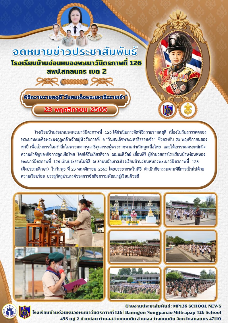 โรงเรียนบ้านง่อนหนองพะเนาว์มิตรภาพที่ 126 ได้ดำเนินการจัดพิธีถวายราชสดุดี เนื่องในวันสวรรคตของพระบาทสมเด็จพระมงกุฎเกล้าเจ้าอยู่หัวรัชกาลที่ 6 "วันสมเด็จพระมหาธีรราชเจ้า" ซึ่งตรงกับ 25 พฤศจิกายนของทุกปี เพื่อเป็นการน้อมรำลึกในพระมหากรุณาธิคุณพระผู้พระราชทานกำเนิดลูกเสือไทย และให้เยาวชนตระหนักถึงความสำคัญของกิจการลูกเสือไทย โดยได้รับเกียรติจาก ผอ.มะลิวัลย์ เขื่อนศิริ ผู้อำนวยการโรงเรียนบ้านง่อนหนองพะเนาว์มิตรภาพที่ 126 เป็นประธานในพิธี ณ ลานหน้าเสาธงโรงเรียนบ้านง่อนหนองพะเนาว์มิตรภาพที่ 126 (ฝั่งประถมศึกษา) ในวันพุธ ที่ 23 พฤศจิกายน 2565 โดยบรรยากาศในพิธี ดำเนินกิจกรรมตามพิธีการเป็นไปด้วยความเรียบร้อย บรรลุวัตถุประสงค์ของการจัดกิจกรรมพัฒนาผู้เรียนด้วยดี