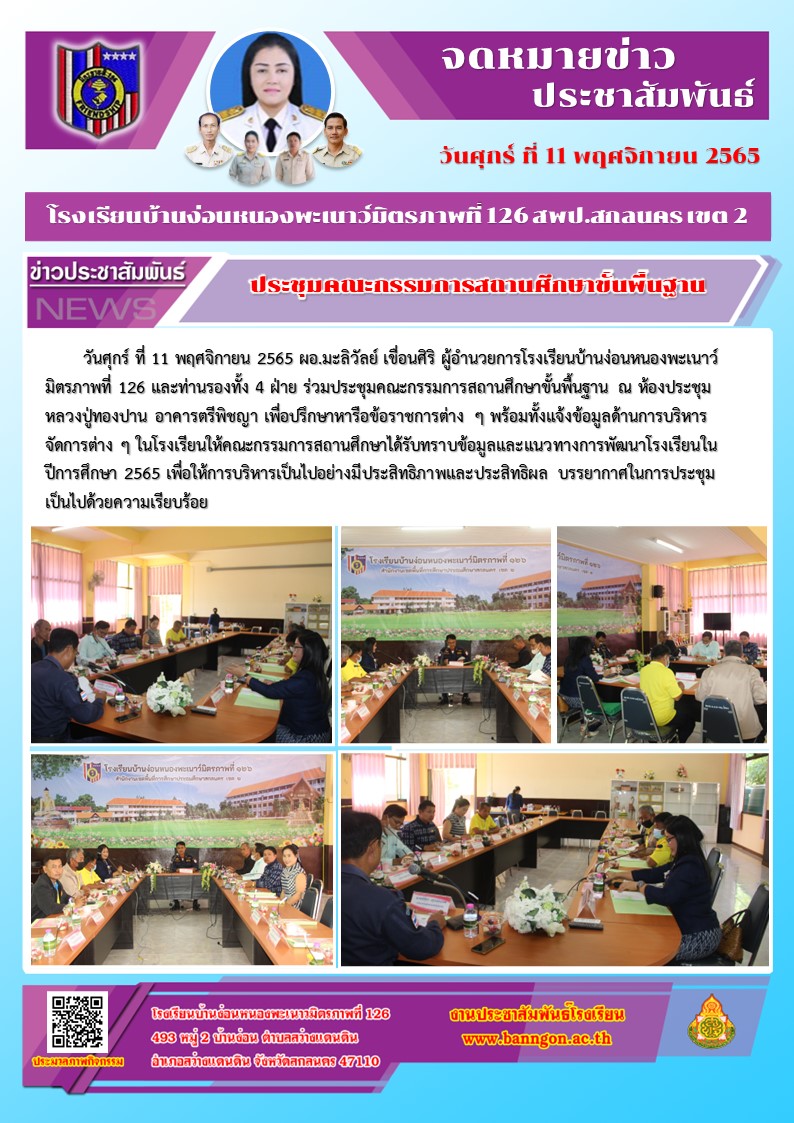วันศุกร์ ที่ 11 พฤศจิกายน 2565 ผอ.มะลิวัลย์ เขื่อนศิริ ผู้อำนวยการโรงเรียนบ้านง่อนหนองพะเนาว์มิตรภาพที่ 126 และท่านรองทั้ง 4 ฝ่าย ร่วมประชุมคณะกรรมการสถานศึกษาขั้นพื้นฐาน ณ ห้องประชุมหลวงปู่ทองปาน อาคารตรีพิชญา เพื่อปรึกษาหารือข้อราชการต่าง ๆ พร้อมทั้งแจ้งข้อมูลด้านการบริหารจัดการต่าง ๆ ในโรงเรียนให้คณะกรรมการสถานศึกษาได้รับทราบข้อมูลและแนวทางการพัฒนาโรงเรียนใน ปีการศึกษา 2565 เพื่อให้การบริหารเป็นไปอย่างมีประสิทธิภาพและประสิทธิผล บรรยากาศในการประชุมเป็นไปด้วยความเรียบร้อย