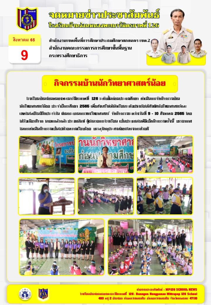 โรงเรียนบ้านง่อนหนองพะเนาว์มิตรภาพที่ 126 ระดับชั้นก่อนประถมศึกษา ดำเนินการจัดกิจกรรมบ้านนักวิทยาศาสตร์น้อย ประจำปีการศึกษา 2565 เพื่อส่งเสริมให้นักเรียนระดับปฐมวัยได้สัมผัสกับวิทยาศาสตร์และเทคโนโลยีในชีวิตประจำวัน ผ่านกระบวนการทางวิทยาศาสตร์ จัดกิจกรรมระหว่างวันที่ 9 - 10 สิงหาคม 2565 โดยได้รับเกียรติจาก นายแกล้วกล้า ประชานันท์ ผู้อำนวยการโรงเรียน เป็นประธานในพิธีเปิดกิจกรรมครั้งนี้ บรรยากาศในการดำเนินกิจกรรมเป็นไปด้วยความเรียบร้อย บรรลุวัตถุประสงค์ของโครงการด้วยดี