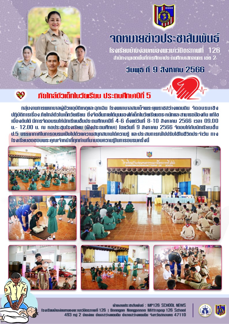 กลุ่มงานการพยาบาลผู้ป่วยอุบัติเหตุและฉุกเฉิน โรงพยาบาลสมเด็จพระยุพราชสว่างแดนดิน จัดอบรมเชิงปฏิบัติการเรื่อง ภัยใกล้ตัวในเด็กวัยเรียน ซึ่งจัดขึ้นภายใต้มุมมองให้เด็กในวัยเรียนตระหนักและสามารถป้องกัน แก้ไขเบื้องต้นได้ มีการจัดอบรมให้นักเรียนชั้นประถมศึกษาปีที่ 4-6 ตั้งแต่วันที่ 8-10 สิงหาคม 2566 เวลา 09.00 น.- 12.00 น. ณ หอประชุมโรงเรียน (ฝั่งประถมศึกษา) โดยจัดอบรมให้กับนักเรียนชั้น ป.4-6 บรรยากาศในการอบรมเป็นไปด้วยความสนุกสนานได้ความรู้ และประสบการณ์ไปปรับใช้ในชีวิตประจำวัน ทางโรงเรียนขอขอบพระคุณเจ้าหน้าที่ทุกท่านที่มามอบความรู้ในการอบรมครั้งนี้